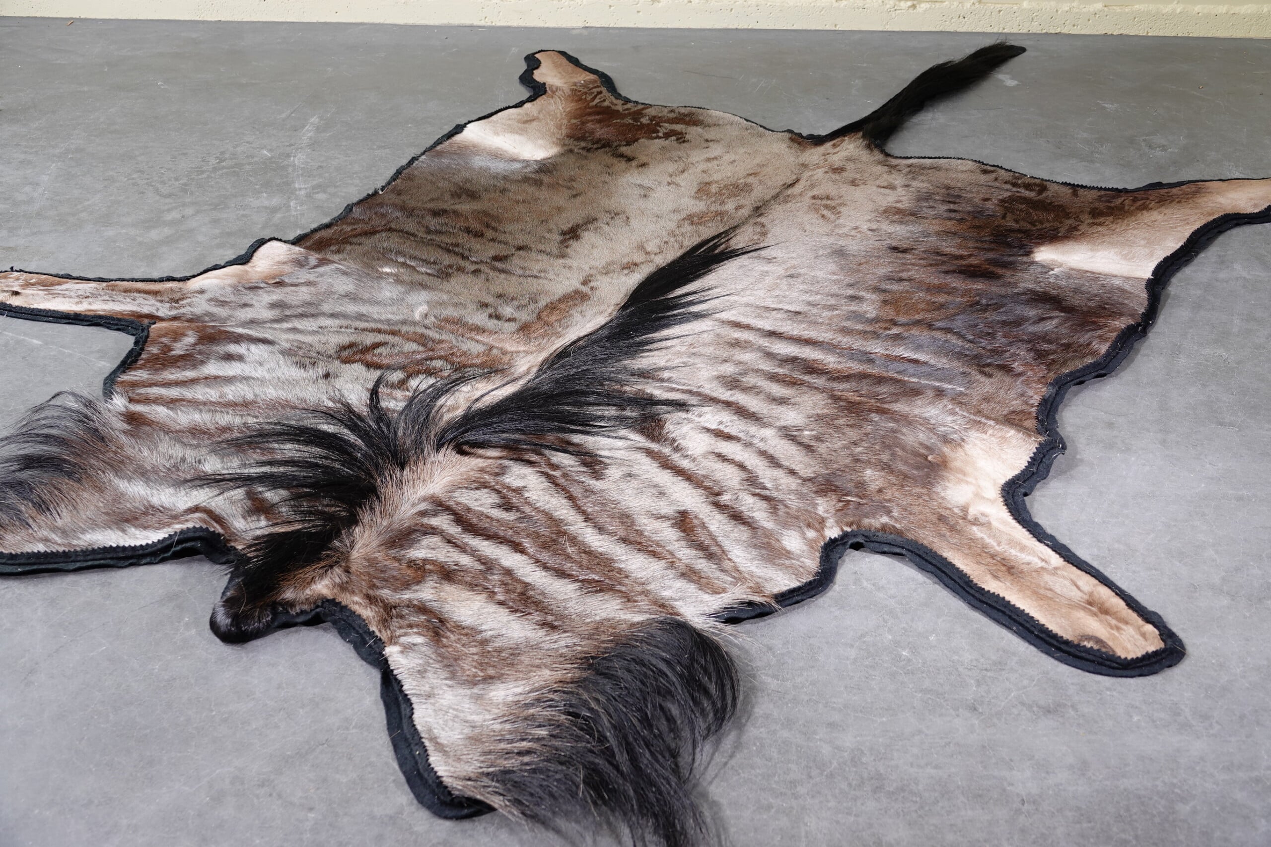 huid van een wildebeest Latijnse naam: Connochaetes taurinus Afmetingen: 175x250cm hoog Staat: In goede conditie, de fotos geven een goede indruk van deze huid