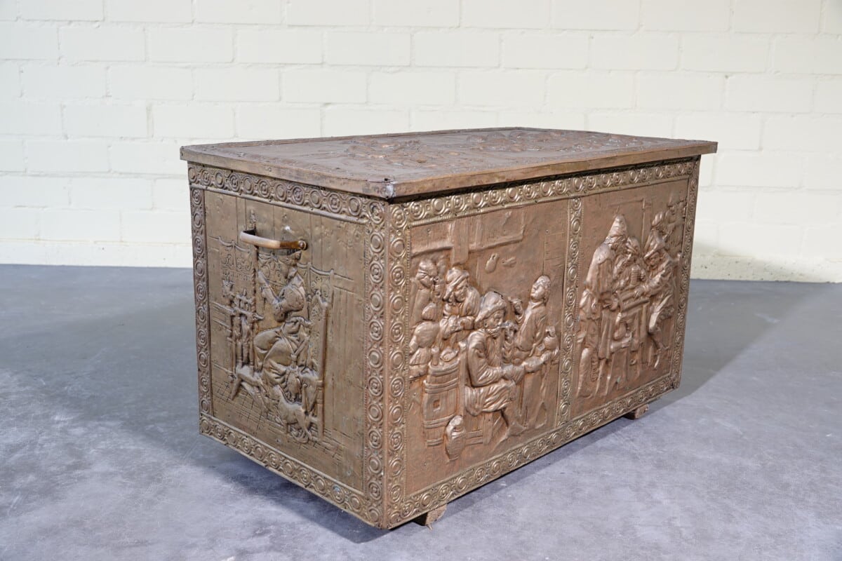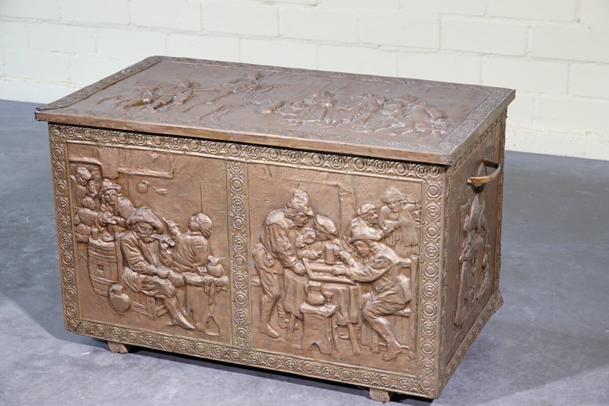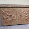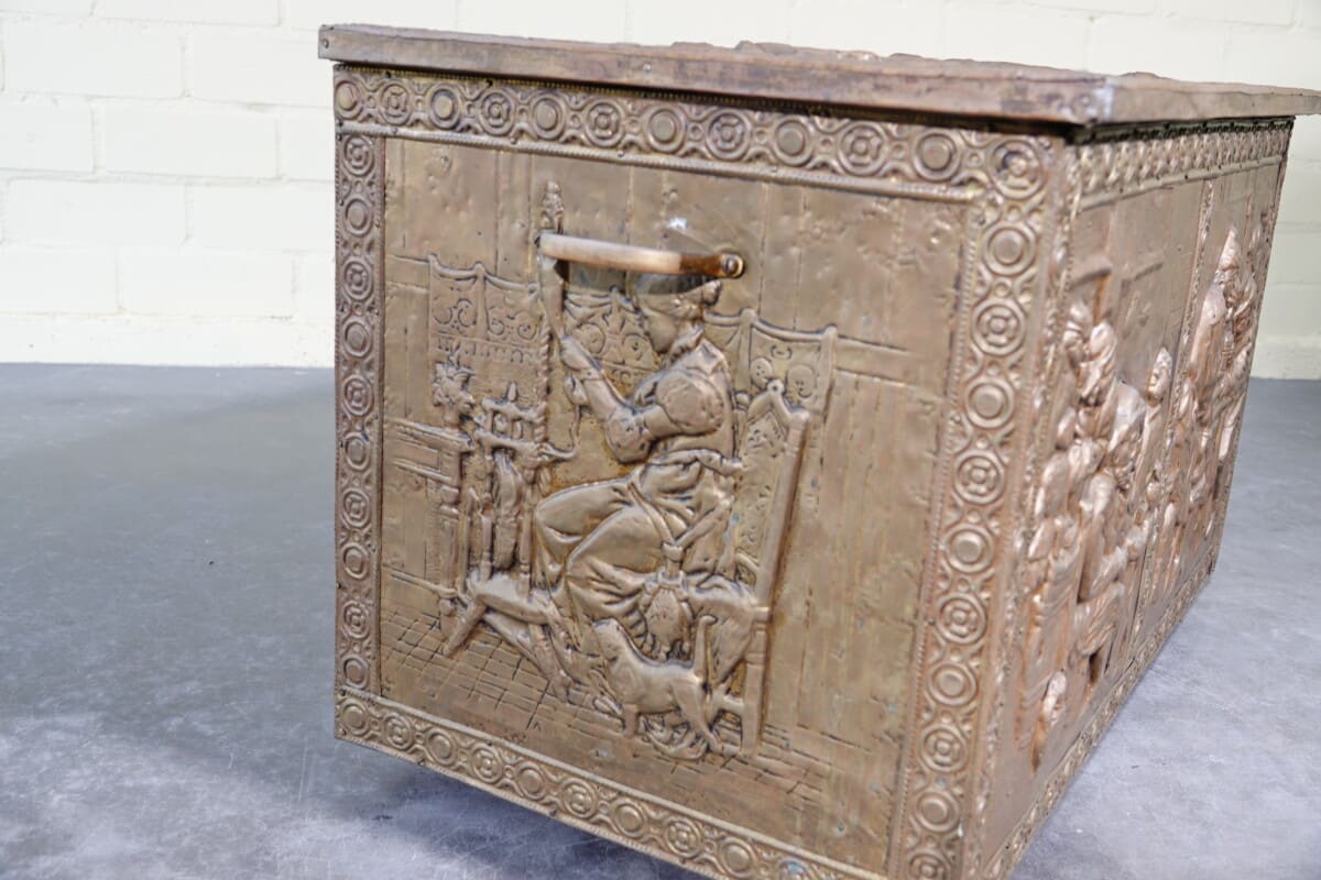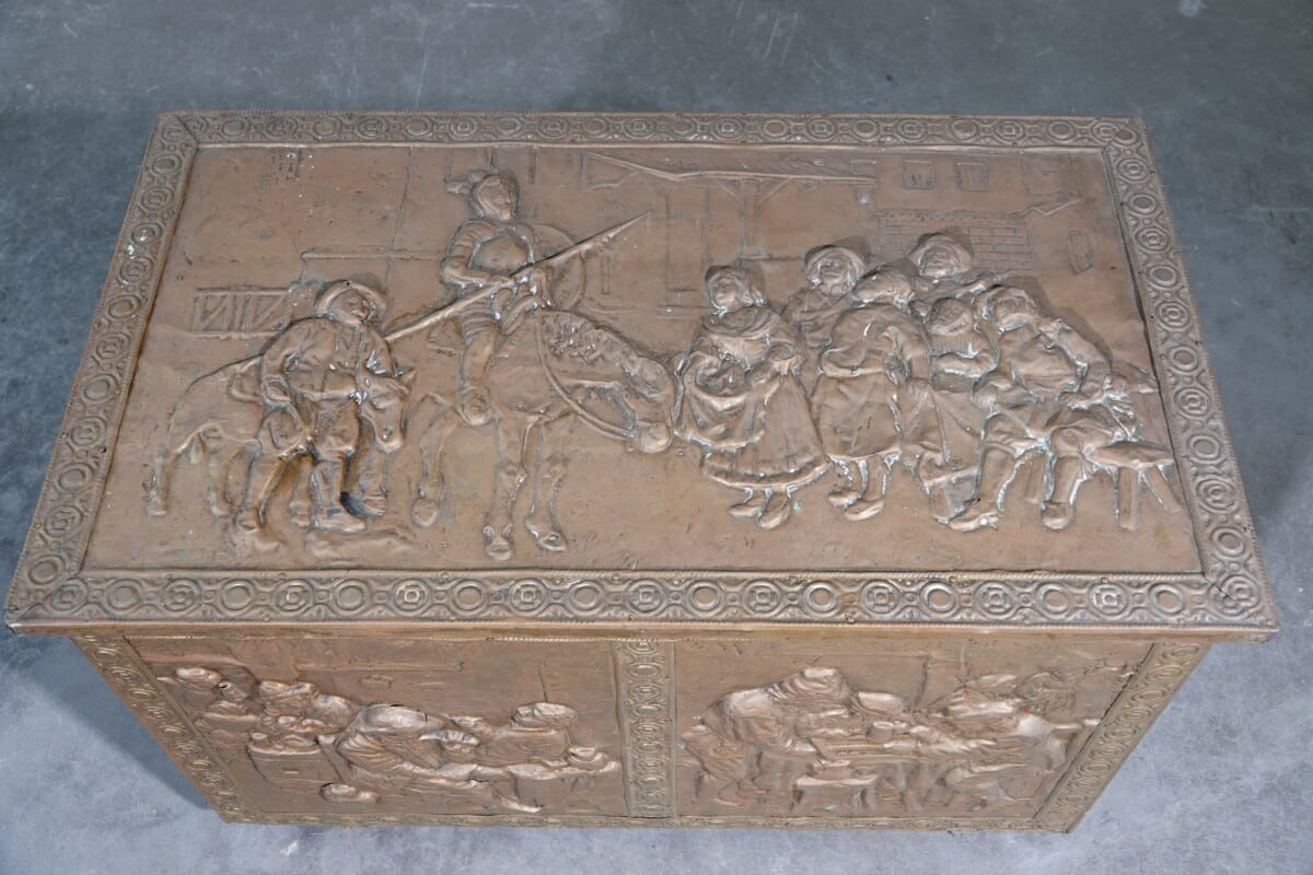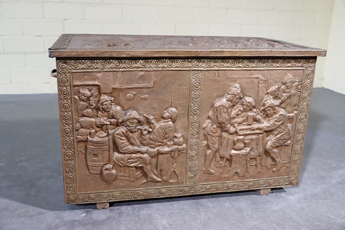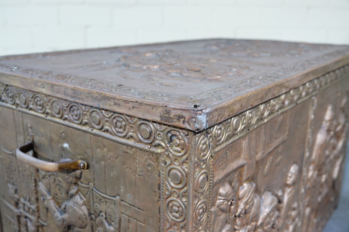 Antieke koperen kist met reliëf – haardkist