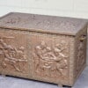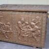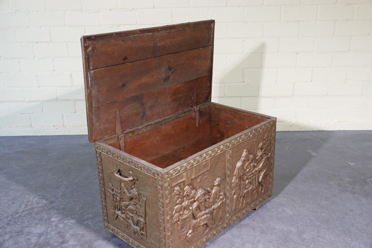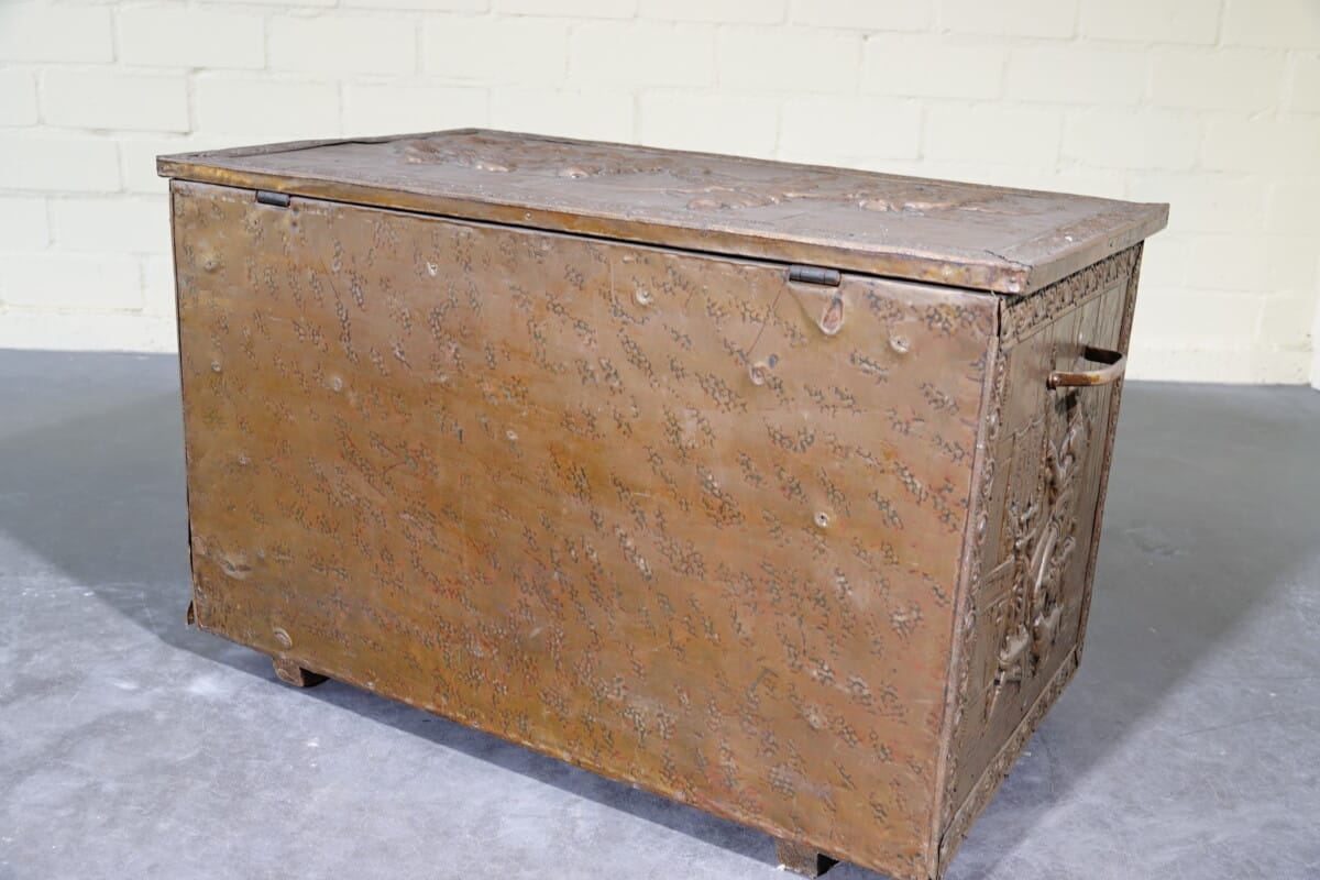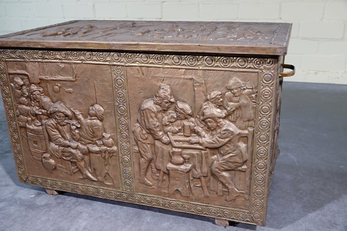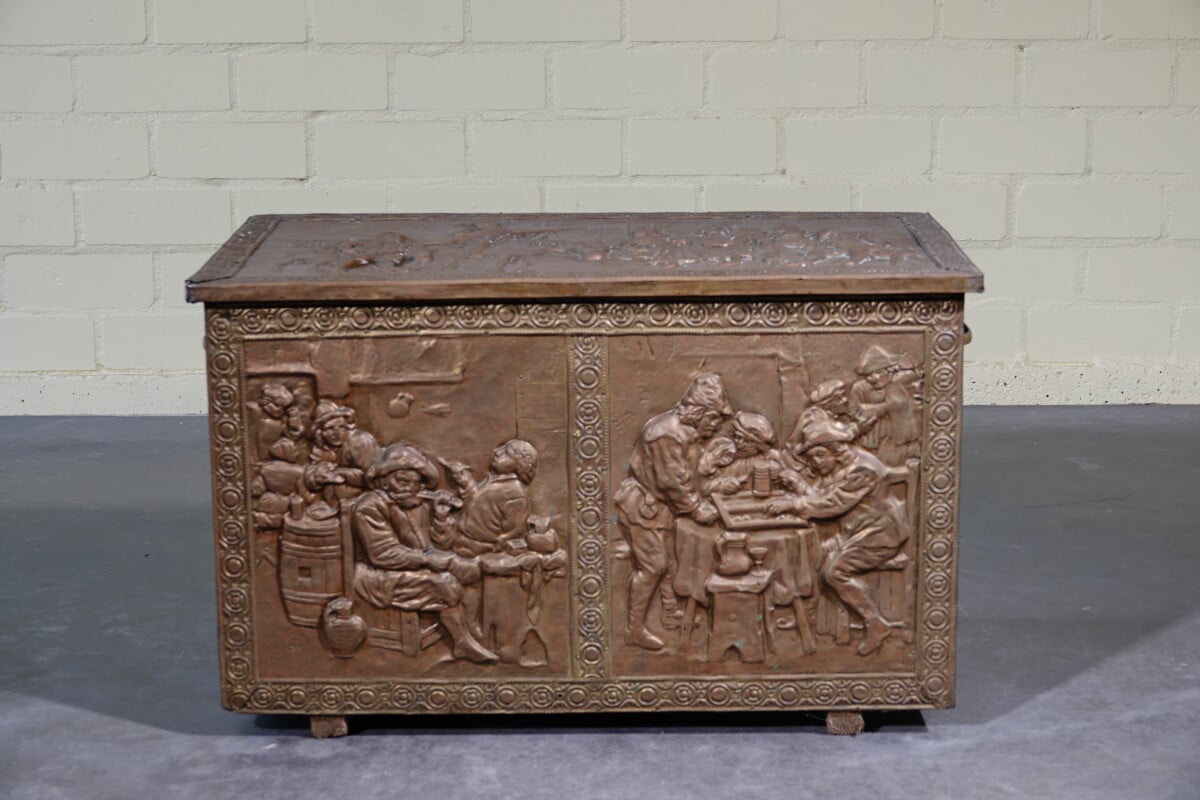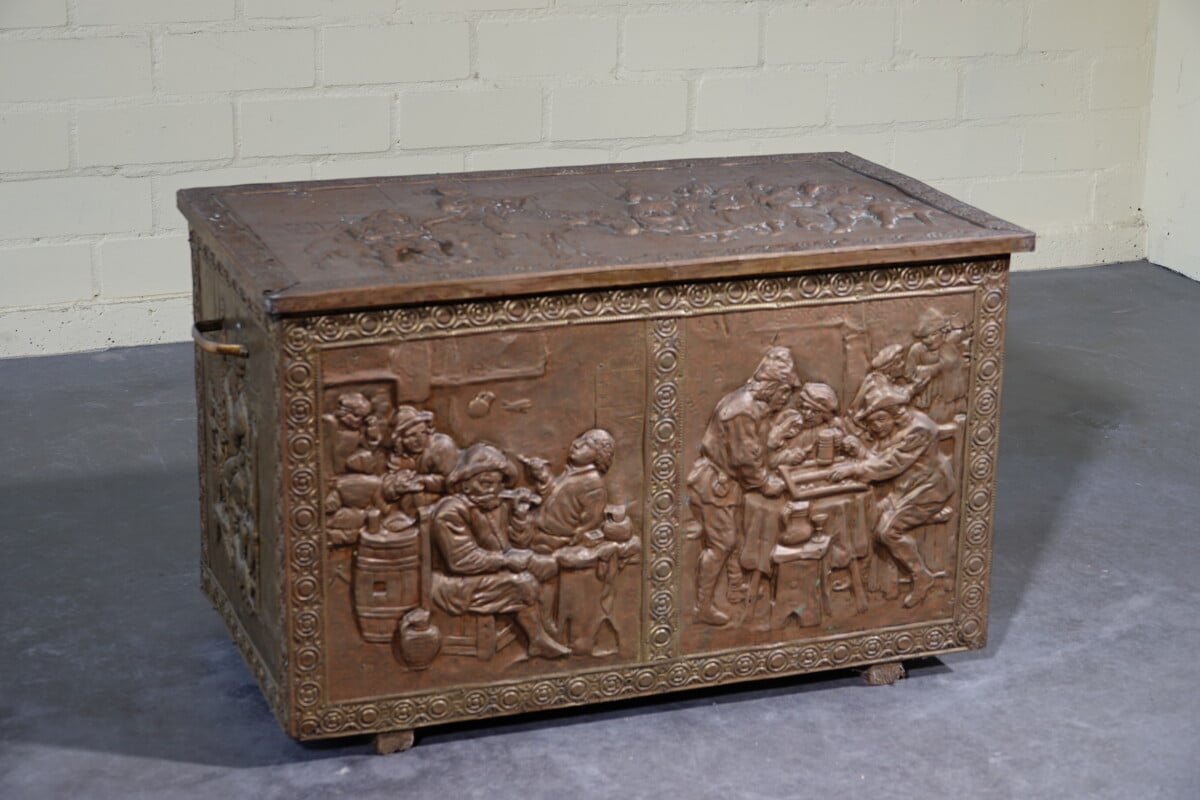 Antieke koperen kist met reliëf – haardkist