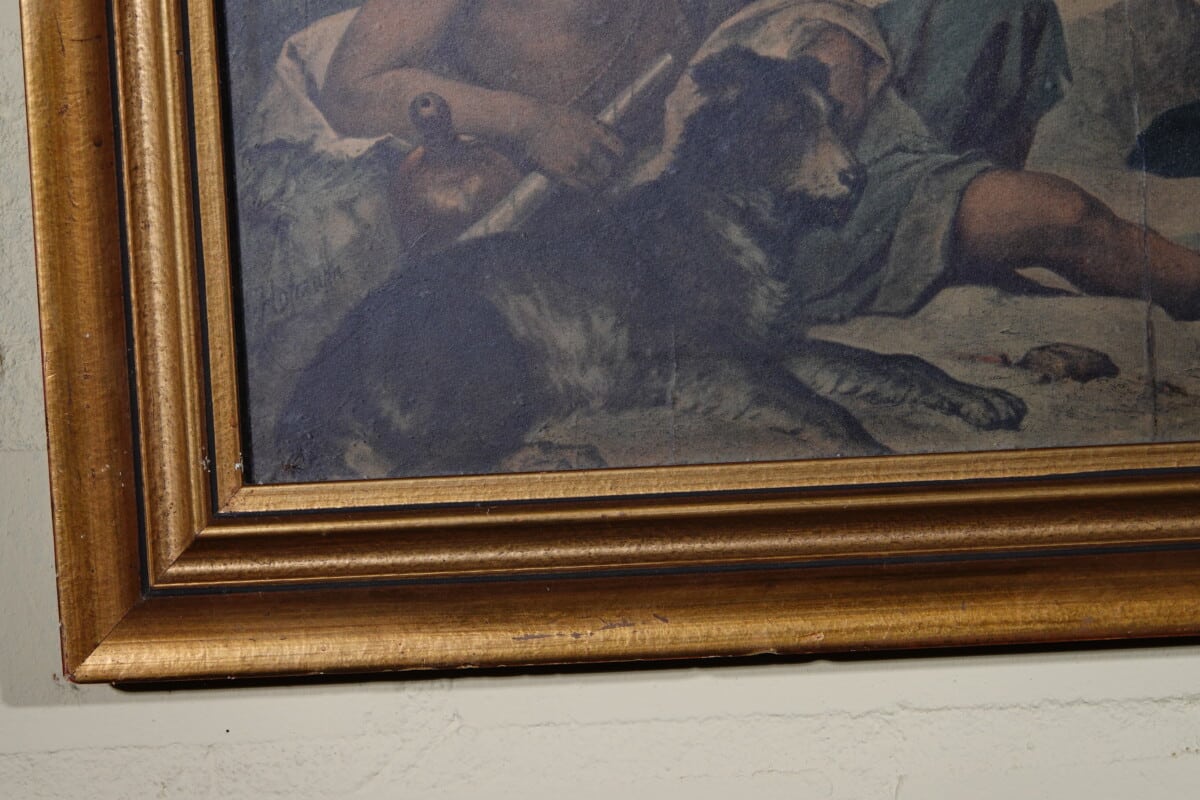 Jager met hond en prooi.