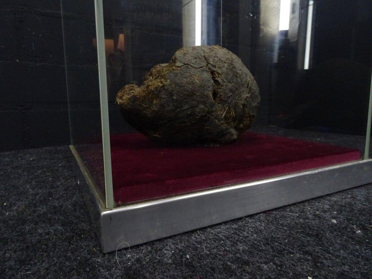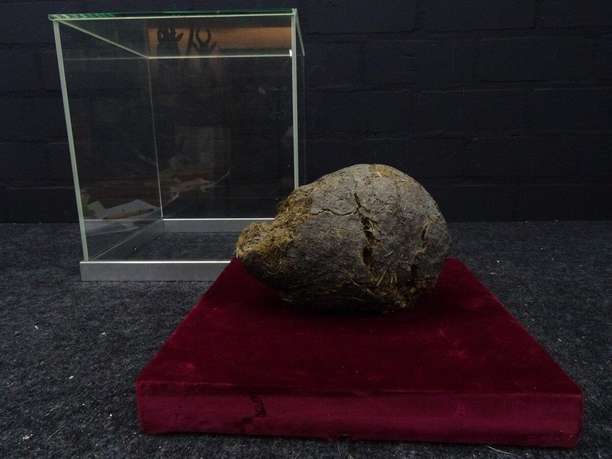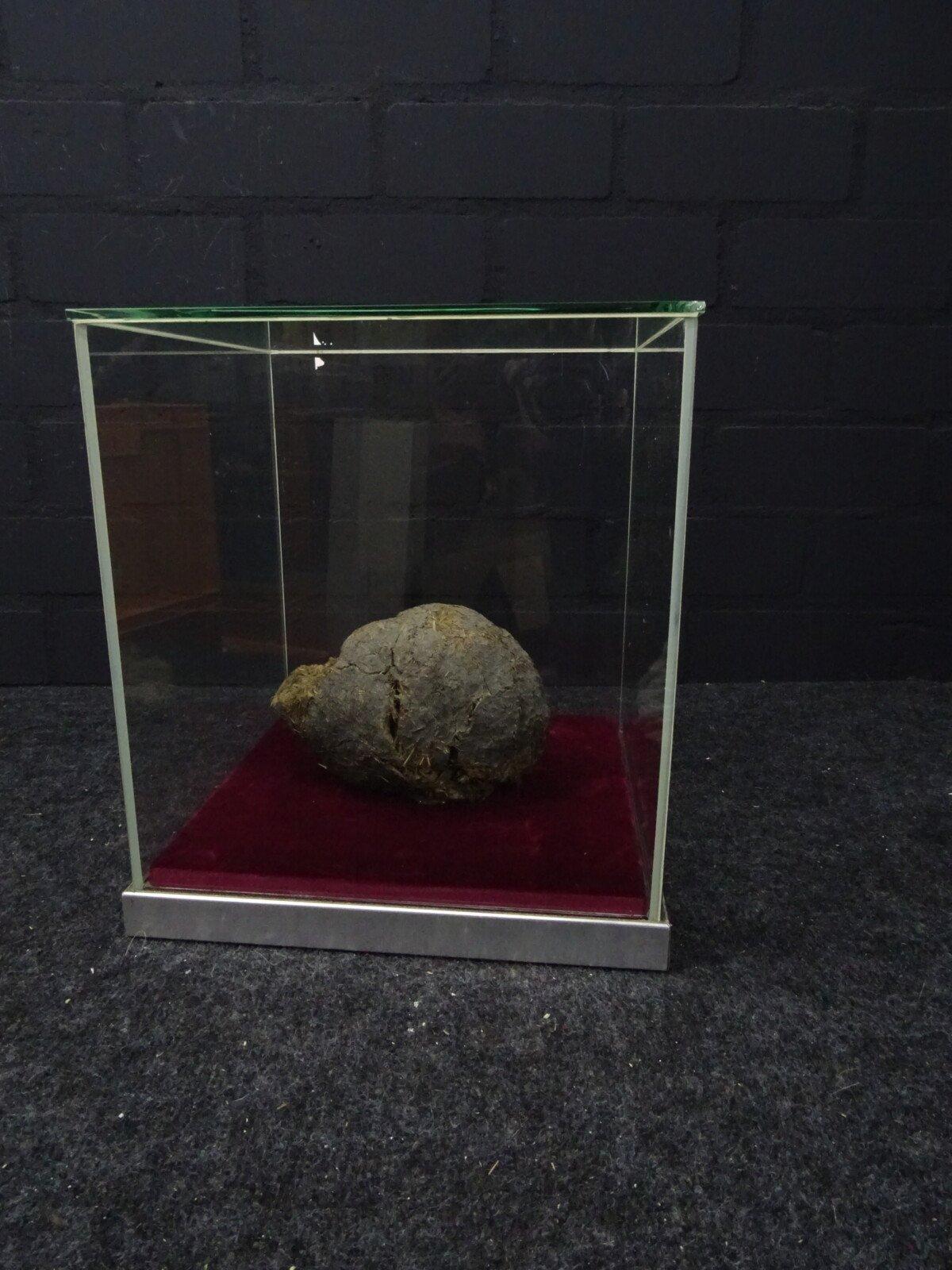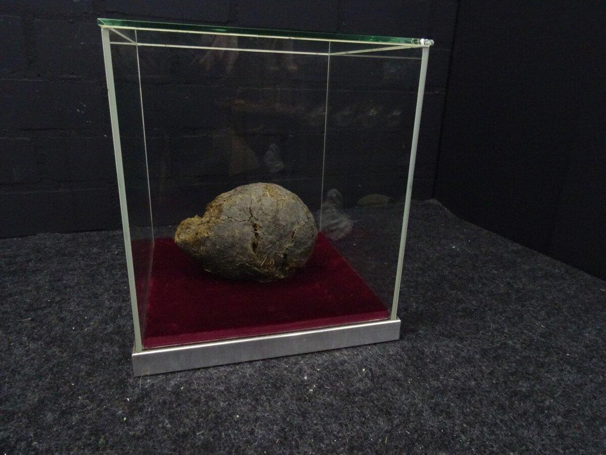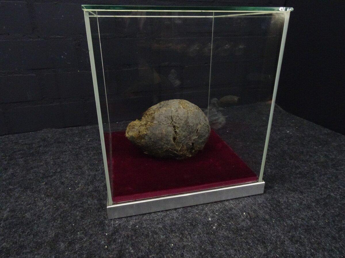 Neushoorn drol in glazen vitrine