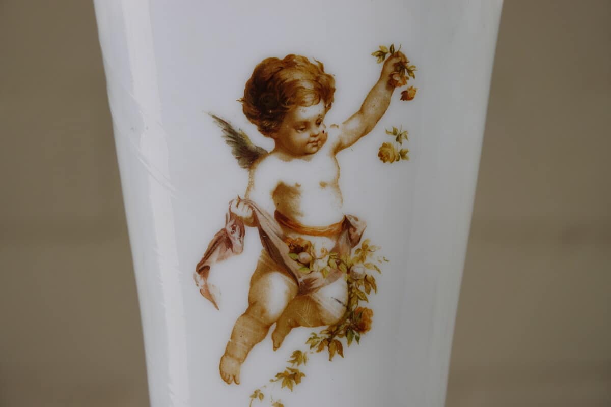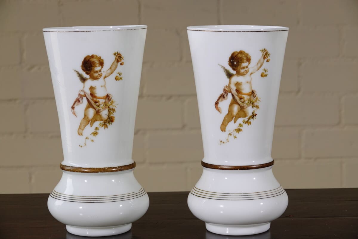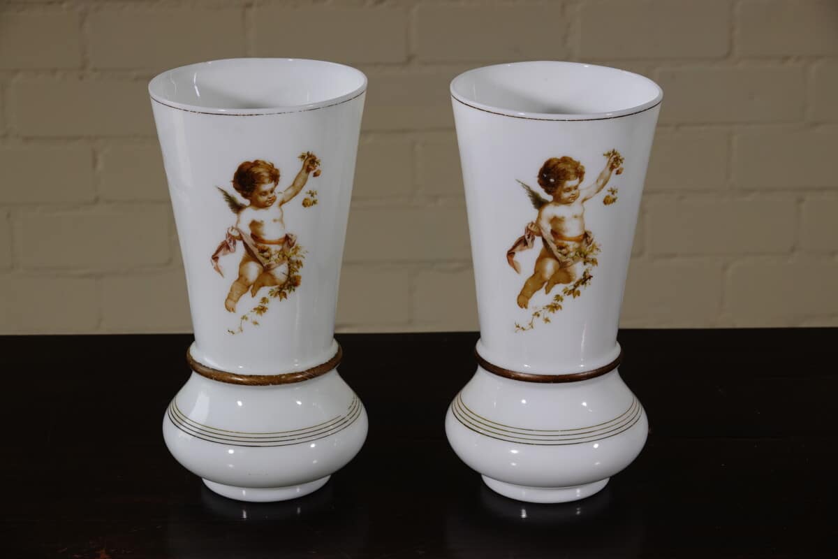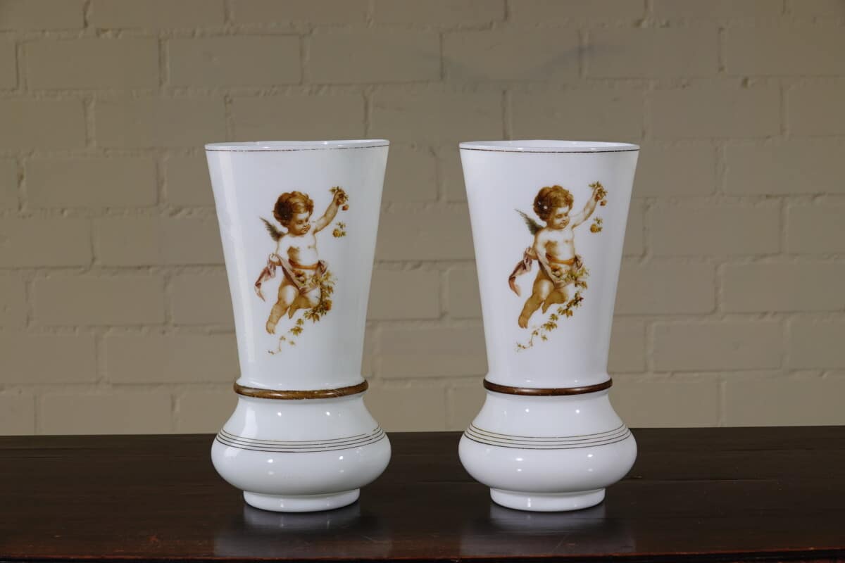 “Paar opaline glazen vazen met cherub decor, ca. 1900